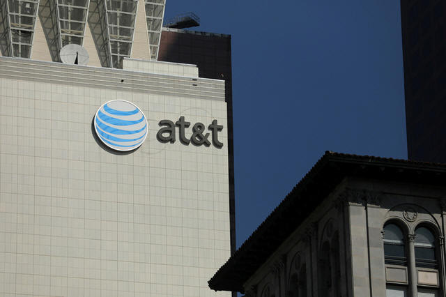 The AT&T logo is pictures on a building in Los Angeles, California,