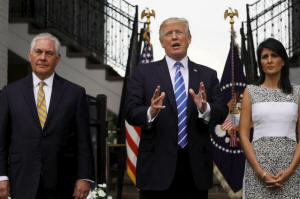 President Donald Trump, flanked by Secretary of State Rex Tillerson