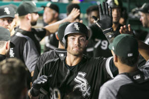 White Sox third baseman Nicky Delmonico (30) is greeted in the