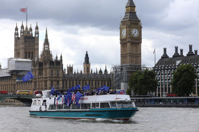 Anti-Brexit, pro-European Union Remain supporters wave flags as they