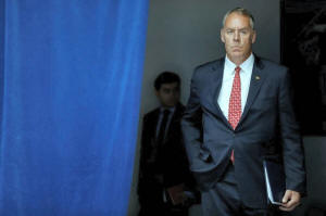 U.S. Interior Secretary Ryan Zinke waits to take the stage with