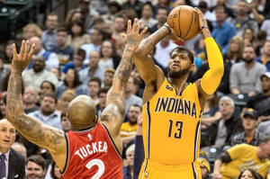 Indiana Pacers forward Paul George (13) shoots the ball over