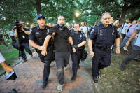 demonstrator taunts Police officials after a Donald