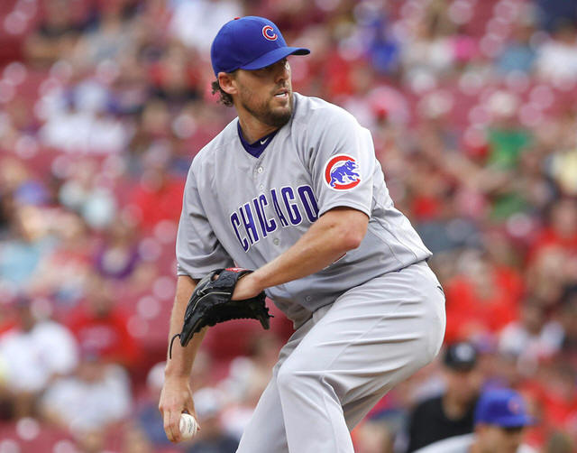 Cubs starting pitcher John Lackey throws against the Cincinnati