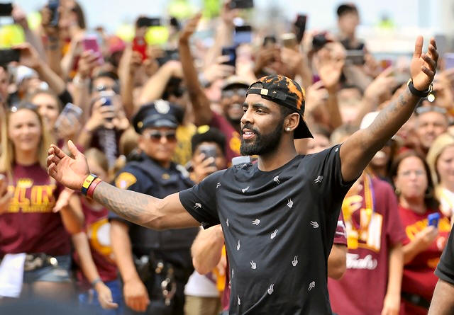Cavaliers guard Kyrie Irving celebrates with fans during the NBA