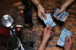 A buyer and seller exchange Mexican pesos in a restaurant in Mexico City, Mexico, August 3, 2017. REUTERS/Edgard Garrido |