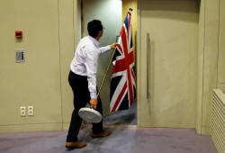 An official carries a Union Jack flag ahead of a news conference by