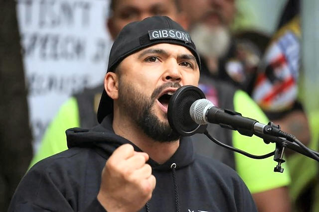 Joey Gibson speaks during the Trump Free Speech Rally in Portland,