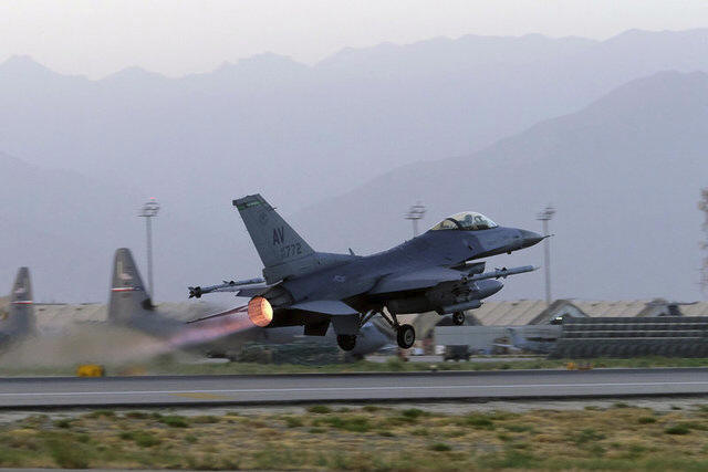 A U.S. Air Force F-16 Fighting Falcon aircraft takes off for a