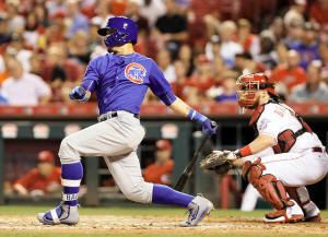 Cubs short stop Javier Baez (left) hits an RBI single against the