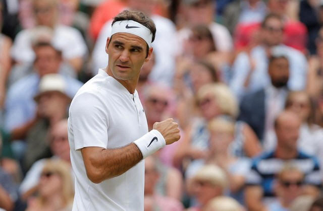 Switzerland’s Roger Federer celebrates winning the first set during