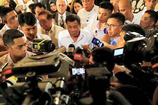 Philippine President Rodrigo Duterte is interviewed by reporters