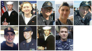A combination photo showing (from L to R, top) Electronics Technician 3rd Class Kenneth Aaron Smith, Interior Communications Electrician 3rd Class Logan Stephen Palmer, Electronics Technician 3rd Class John Henry Hoagland III, Electronics Technician 3rd Class Dustin Louis Doyon, Electronics Technician 3rd Class Jacob Daniel Drake, (from L to R, bottom) Information Systems Technician 2nd Class Timothy Thomas Eckles Jr., Electronics Technician 2nd Class Kevin Sayer Bushell, Interior Communications Electrician 1st Class Abraham Lopez and Electronics Technician 1st Class Charles Nathan Findley, who was stationed aboard the USS John S. McCain when it collided with a merchant vessel in waters near Singapore and Malayasia, August 21, 2017, are shown in these undated photos provided August 24, 2017. U.S. Navy/Handout via REUTERS |