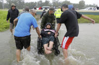 An elderly woman in a wheelchair is rescued from the flood