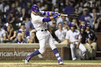 Cubs center fielder Albert Almora Jr. (5) hits an RBI double
