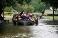 People evacuate by boat from the Hurricane Harvey floodwaters in