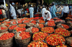 People walk past baskets of tomatoes in the Yankaba market in Kano,