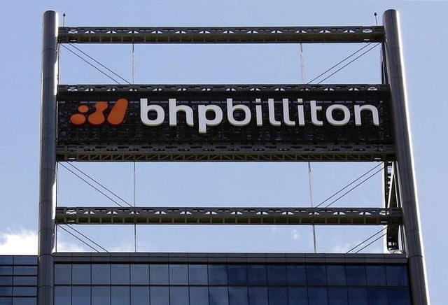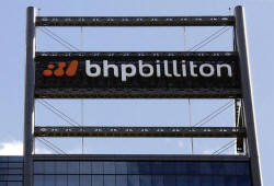 A sign adorns the building where mining company BHP Billiton has