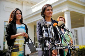 Penny Nance (L) as she talks to reporters about President Trump's