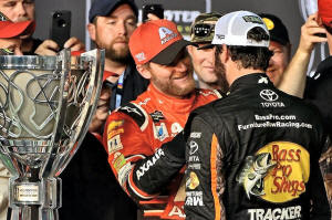 (88) congratulates NASCAR Cup Series driver Martin Truex Jr. (78) on