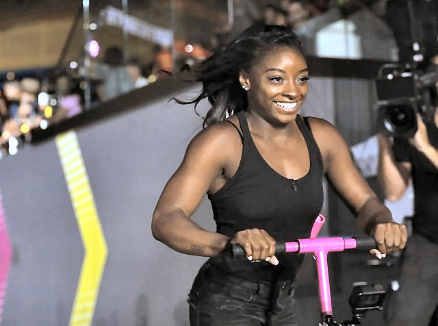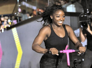 Olympic gymnast Simone Biles rides a scooter during the show.