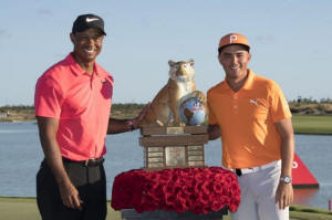 Tiger Woods (left) poses for a photo with winner Rickie Fowler