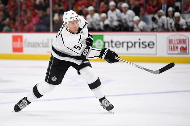 Kings defenseman Christian Folin (5) scores a goal against the