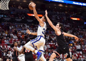 Warriors guard Stephen Curry (30) is fouled by Miami Heat guard