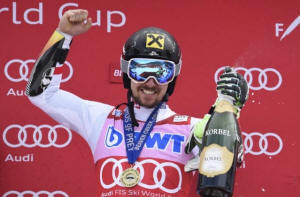 Marcel Hirscher of Austria celebrates on the podium after the men's