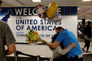 hugs his daughters Laila, 6, and Farida, 8, as they arrive at