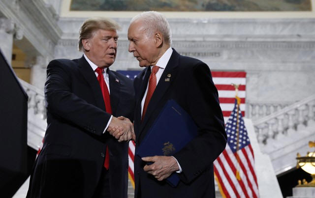 President Donald Trump is greeted by Sen. Orrin Hatch (R-UT) prior