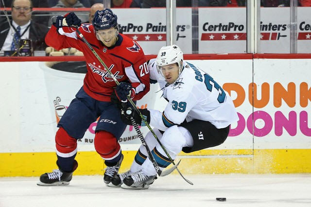 Capitals center Lars Eller (20) and San Jose Sharks center Logan