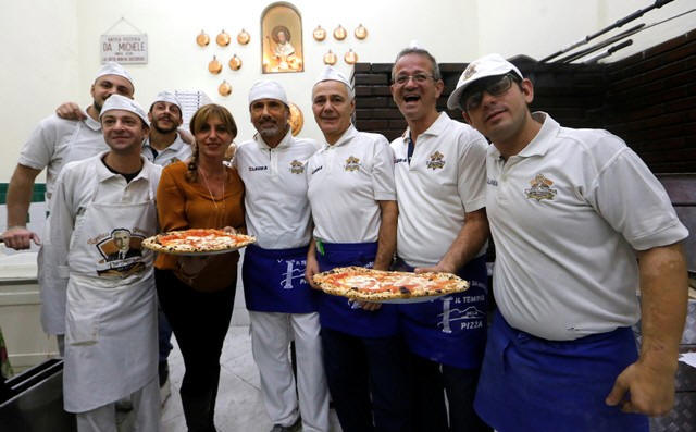 da Michele pose with pizza in Naples, Italy December 6, 2017.