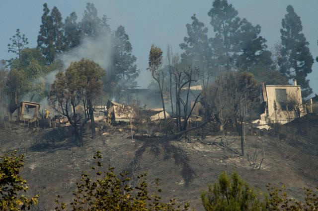 Smoke rises from a home damaged by the Skirball fire near the