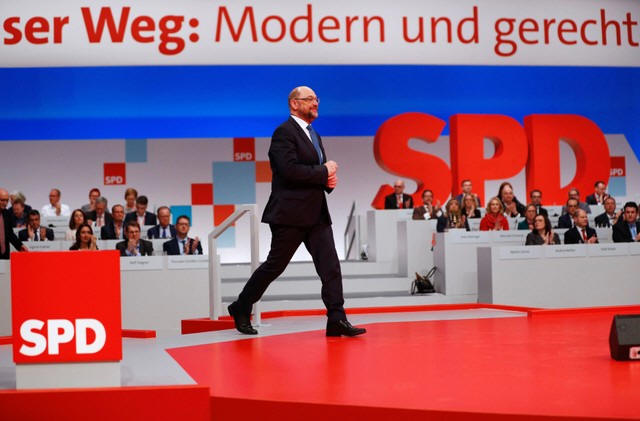 Social Democratic Party (SPD) leader Martin Schulz walks onto a podium during an SPD party convention in Berlin, Germany, December 7, 2017. REUTERS/Fabrizio Bensch |