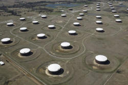 Crude oil storage tanks are seen from above at the Cushing oil hub,