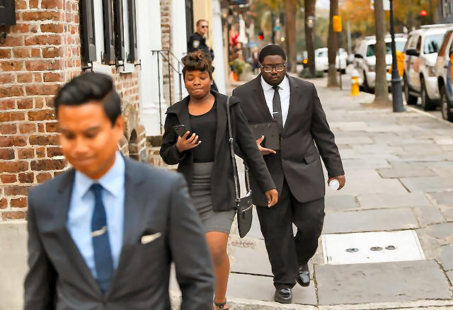 Walter Scott's son Miles Scott (R) leaves the Charleston federal