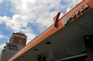 The corporate logo of the state oil company PDVSA is seen at a gas