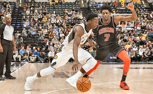 Pacers guard Victor Oladipo (4) drives to the basket against Chicago