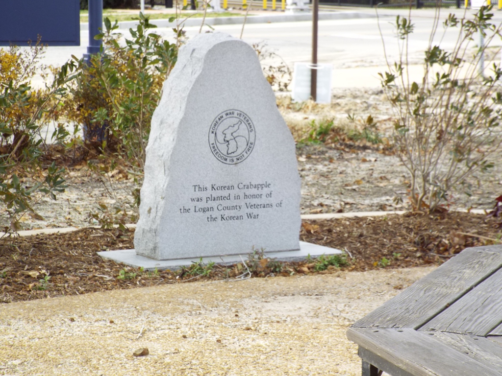 The granite marker faces the Crabapple tree in the center of the south lawn. The marker reads “This Korean Crabapple was planted in honor of the Logan County Veterans of the Korean War. The marker was placed on the site as an Eagle Scout project for Caleb Meader. The scout visited the Lincoln City Council in March of 2016 and asked permission to place the marker at the tree. He said the tree had been planted to commemorate those who served in the Korean War. But because there was no marker, a lot of people were unaware of this. He wanted to preserve this dedication and make sure that the tree was recognized for its intended purpose for generations to come.