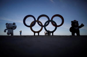 mascot Bandabi and the Olympic Rings are displayed at the Gyeongpodae