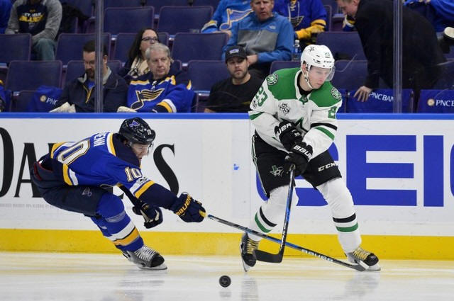 Stars defenseman Esa Lindell (23) clears the puck past St. Louis