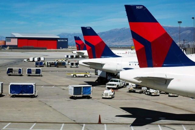 Delta planes line up at their gates while on the tarmac of Salt Lake