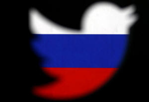 A 3D-printed Twitter logo displayed in front of Russian flag is seen