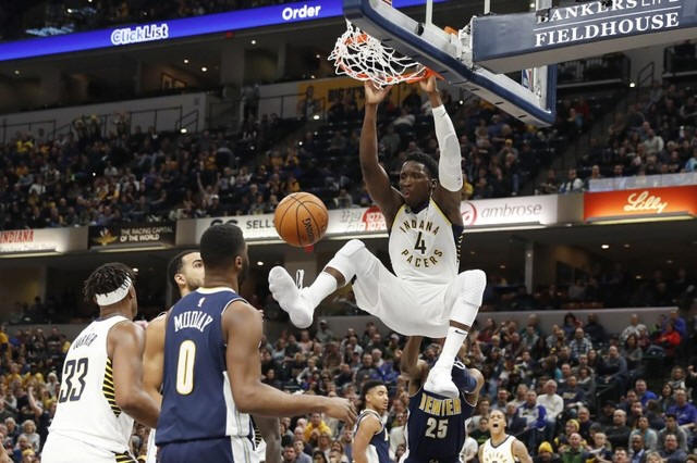 Pacers guard Victor Oladipo (4) dunks against the Denver Nuggets