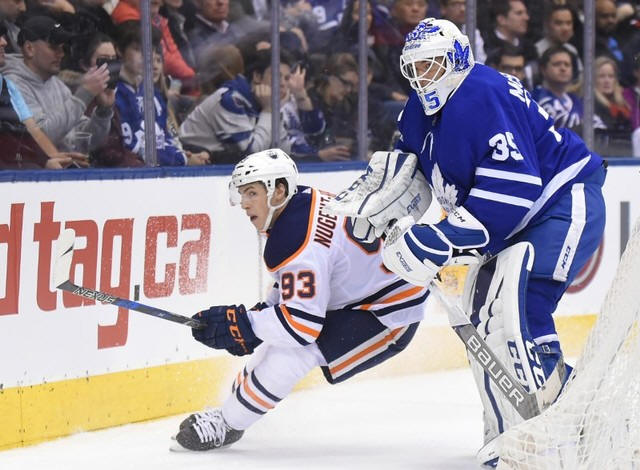 Oilers forward Ryan Nugent-Hopkins (93) pursues the puck after it is