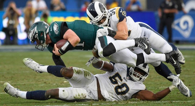 Eagles quarterback Carson Wentz (11) is tackled by Los Angeles Rams