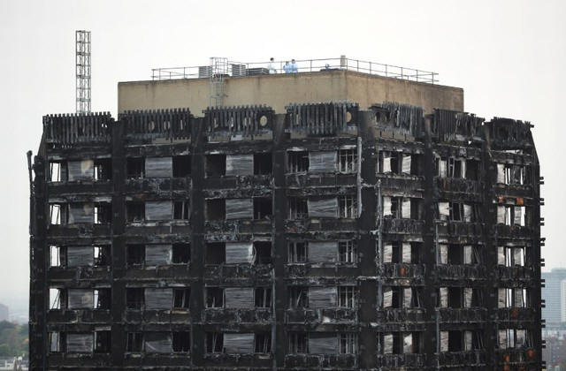Workers stand on the roof of the burnt out remains of the Grenfell