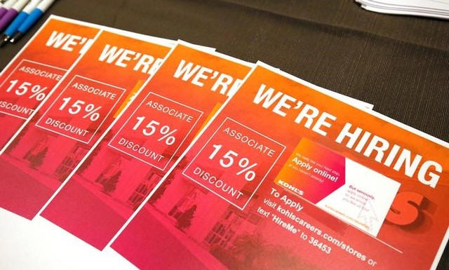 Signs seeking workers for Kohl's are seen at a job fair in Golden, Colorado, June 7, 2017. REUTERS/Rick Wilking |