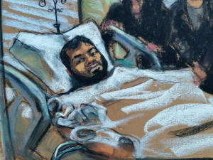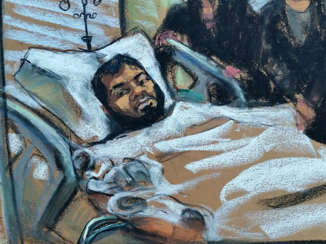hearing from his bed in Bellevue Hospital in New York, NY, U.S.,
